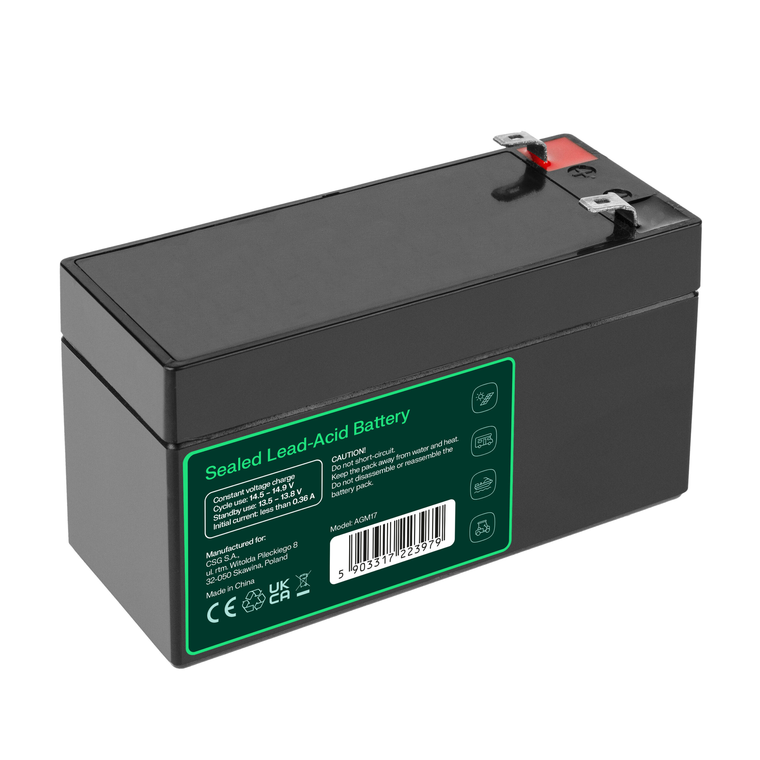 Warranty: 24 months; Cells manufacturer: Greencell; Voltage: 12V; Type: VRLA AGM; Colour: Black; Overdischarge protection: Yes; Overcharge protection: Yes; Product code: AGM17; Manufacturer: Greencell; Surge protection: Yes; Size: 97 × 45 × 57 mm; Weight: 0.55 kg; Capacity: 1.2Ah; Popular model: Yes; Terminal: Faston 187 (F1); Vitality: up to 5 years; Max. discharge current: above 3C; Maksymalny pr¹d ³adowania: 0.36A;