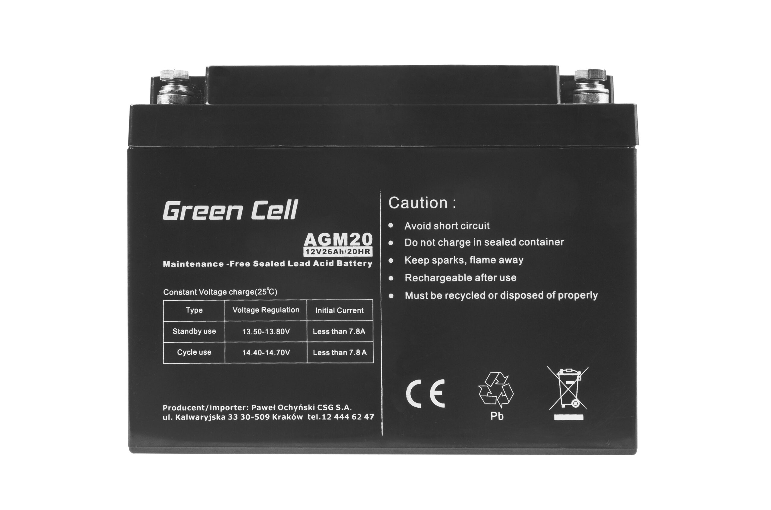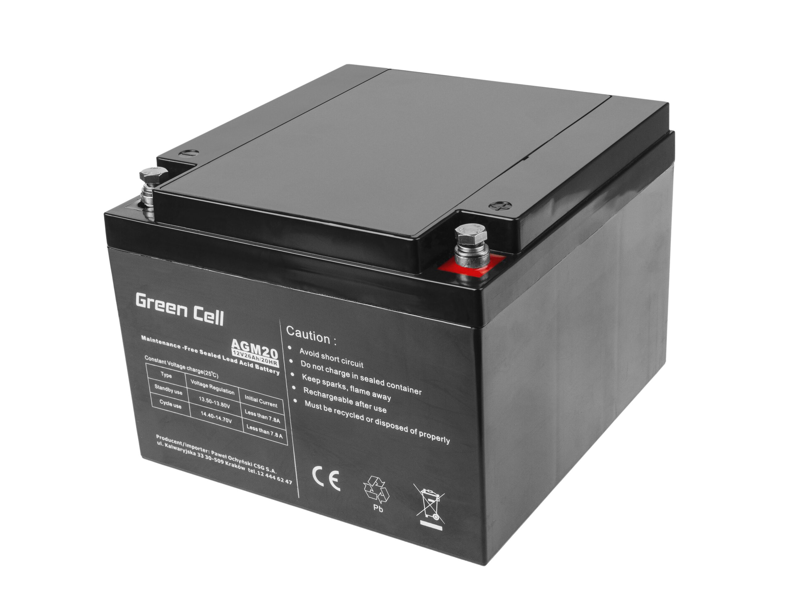 Warranty: 12 months; Cells manufacturer: Greencell; Voltage: 12V; Type: VRLA AGM; Colour: Black; Overdischarge protection: Yes; Overcharge protection: Yes; Product code: AGM20; Manufacturer: Greencell; Surge protection: Yes; Size: 175 × 166 × 125 mm; Weight: 7.25 kg; Capacity: 26Ah; Popular model: Yes; Terminal: B2; Vitality: up to 5 years; Max. discharge current: above 3/C;