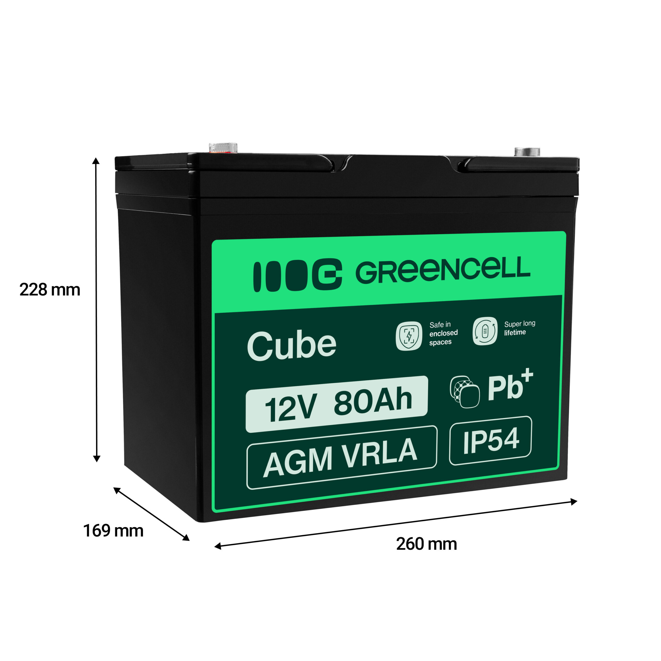 Warranty: 24 months; Voltage: 12V; Type: VRLA AGM ; Colour: Black; Product code: AGM57; Manufacturer: Greencell; Size: 260x169x228 mm; Weight: 22,4 kg; Capacity: 80Ah; Terminal: T1; Vitality: more than 5 years; Maksymalny pr¹d ³adowania: 20A;