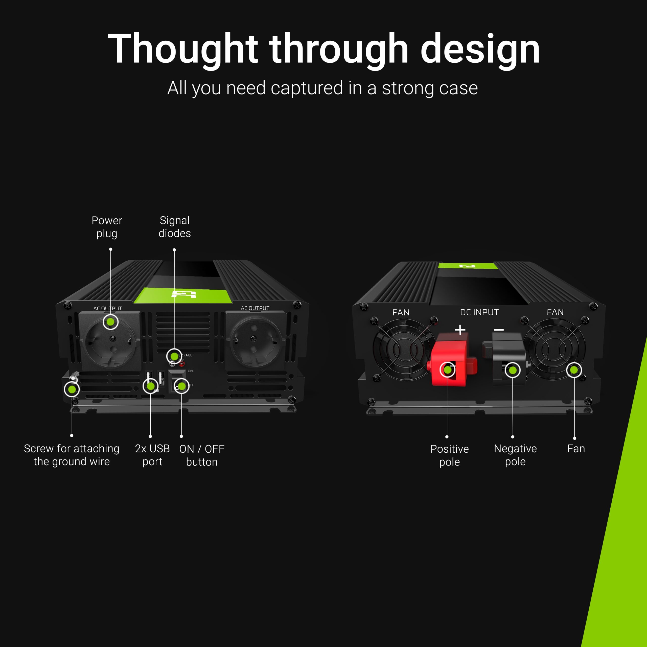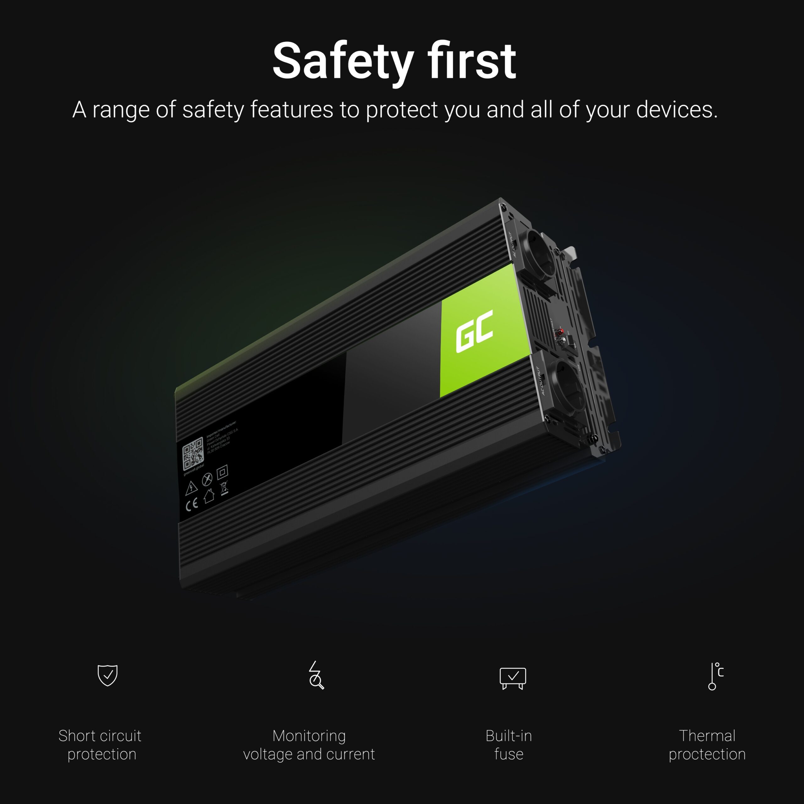 Warranty: 24 months; Output: 2x network socket, 1x USB port (5V / 1A-2.1A) ; Colour: Black; Overheat protection: Yes; Product code: INV15; Manufacturer: Greencell; Surge protection: Yes; Indicator: LED indicators; Input Voltage: 12V DC; Output Voltage: 220V AC; Output frequency: 50Hz; Shape of the output voltage: Pure Sinusoid; Efficiency: 90%; Included: 2x connection cable to the battery clamp, 8x fuse, user manual; Usable power (continuous): 3000W; Instantaneous power (impulsive): 6000W; Other: Cooling with Turbo Cooling fan;