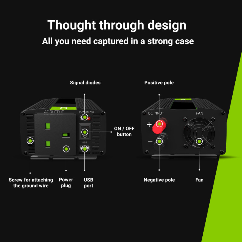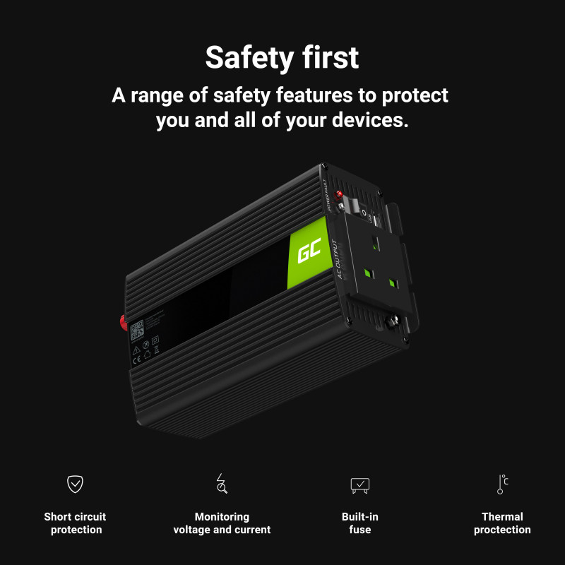 Warranty: 24 months; Product code: INV23UK; Manufacturer: Greencell; Input Voltage: 24V DC; Output Voltage: 230V AC; Output frequency: 50Hz; Shape of the output voltage: Modified sine wave; Usable power (continuous): 1000W; Instantaneous power (impulsive): 2000W;