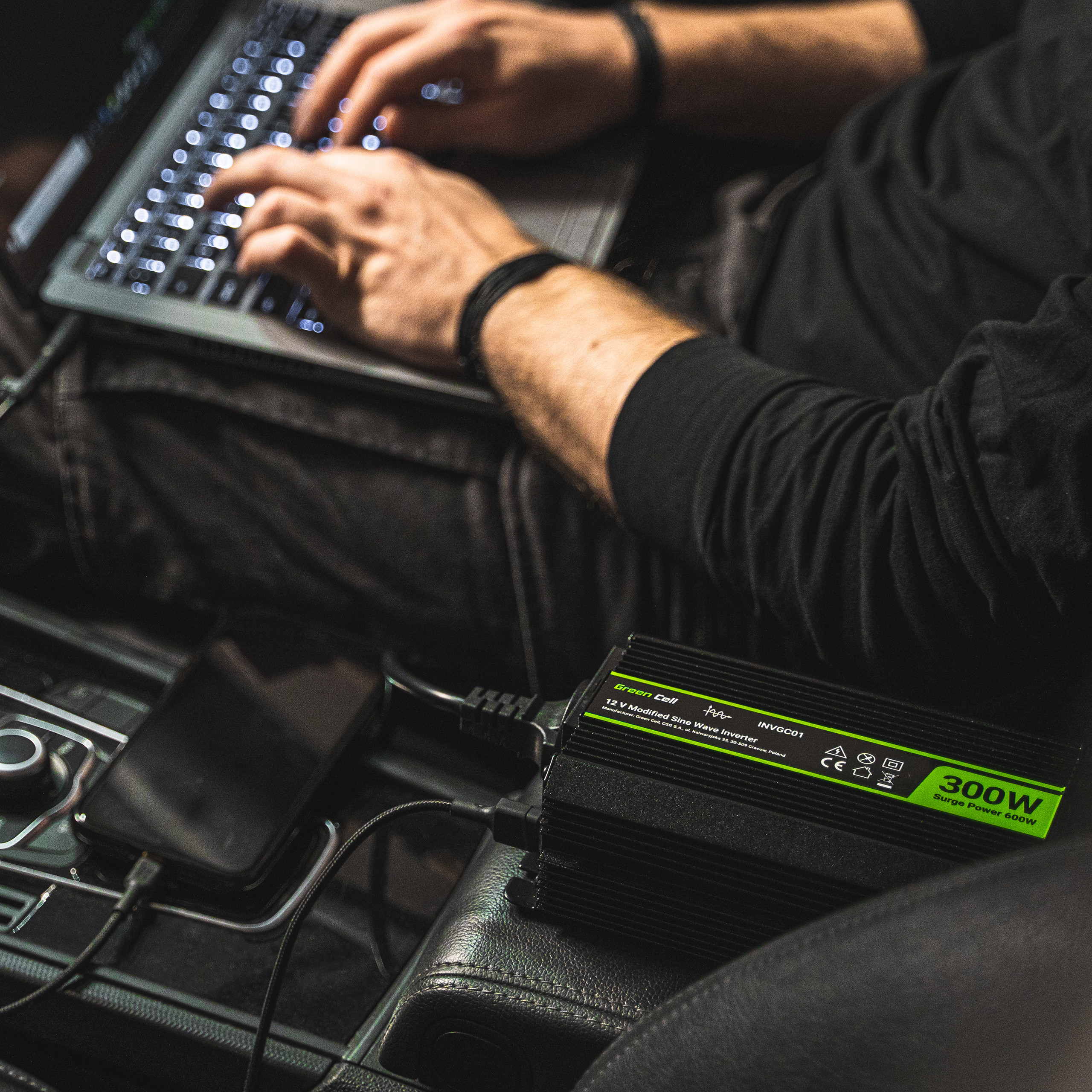 Warranty: 12 months; Colour: Black; Product code: INVGC06; Manufacturer: Greencell; Input Voltage: 12V DC; Output Voltage: 230V AC; Output frequency: 50Hz; Usable power (continuous): 150W; Instantaneous power (impulsive): 300W;