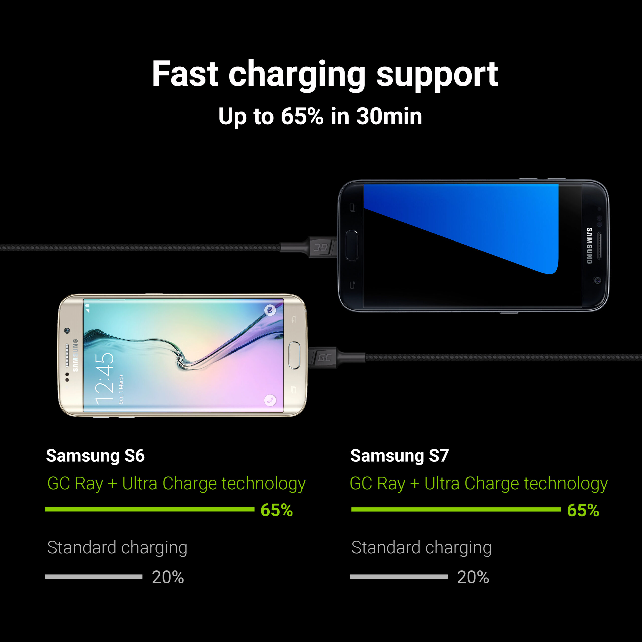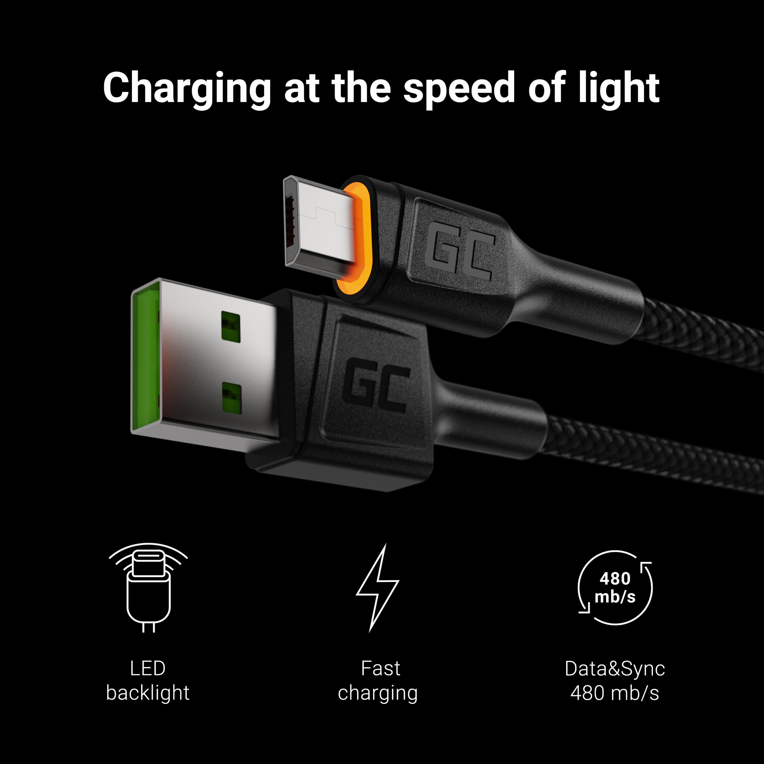 Warranty: 24 months; Colour: Black; Product code: KABGC11; Manufacturer: Greencell; Length: 2m; Model: GC Ray; Backlight: Yes; Plug type: USB – Micro USB; Compatible quick charging technologies: Quick Charge 3.0, GC Ultra Charge, Samsung AFC;