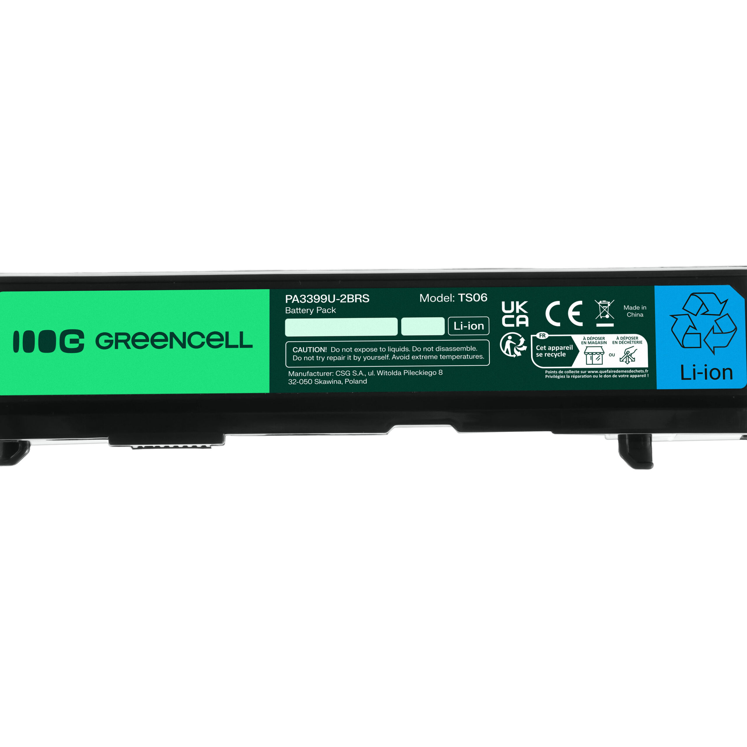 Warranty: 12 months; Cells manufacturer: Greencell; Voltage: 10.8V (11.1V); Number of cells: 6; Cells technology: Li-Ion; Colour: Black; Overdischarge protection: Yes; Overcharge protection: Yes; Product code: TS06; Manufacturer: Greencell; Size: 206x47x22mm; Weight: 300g; Capacity: 4400 mAh;